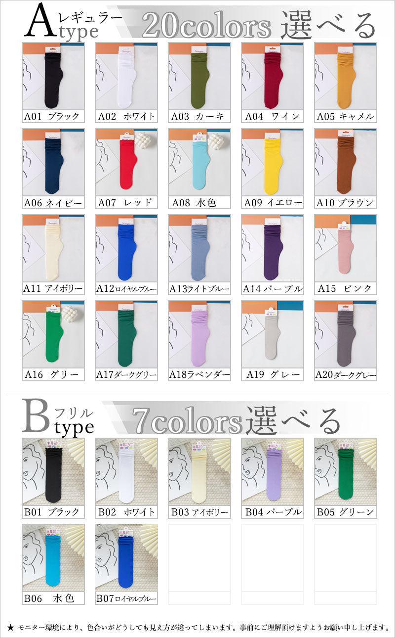 - ブラック、ホワイト、カーキ、ワイン、キャラメル、ネイビー、レッド、水色、イエロー、ブラウン、アイボリー、ロイヤルブルー、ライトブルー、パープル、ピンク、グリーン、ダークグリーン、ラベンダー、グレー、ダークグレー