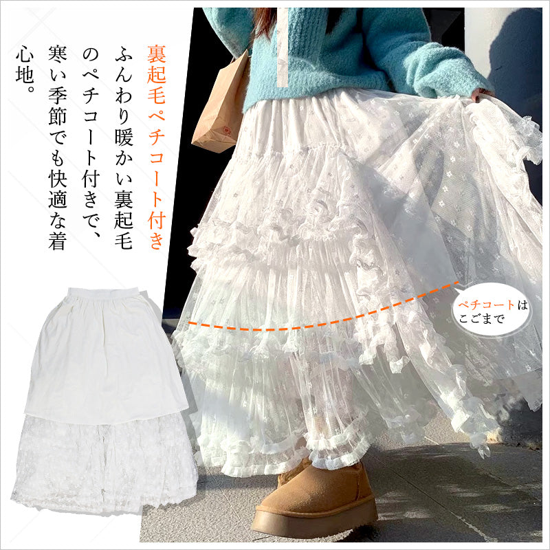 裏起毛ペチコート付き:内側にあたたかい裏起毛ペチコートがあり、寒い季節も快適。