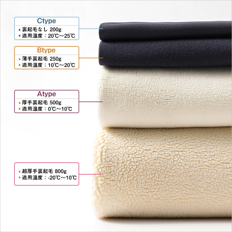 3タイプ選択可能:厚手の裏起毛、薄手の裏起毛、裏起毛なしの3種類から選べるので、季節や用途に応じた快適さを提供。