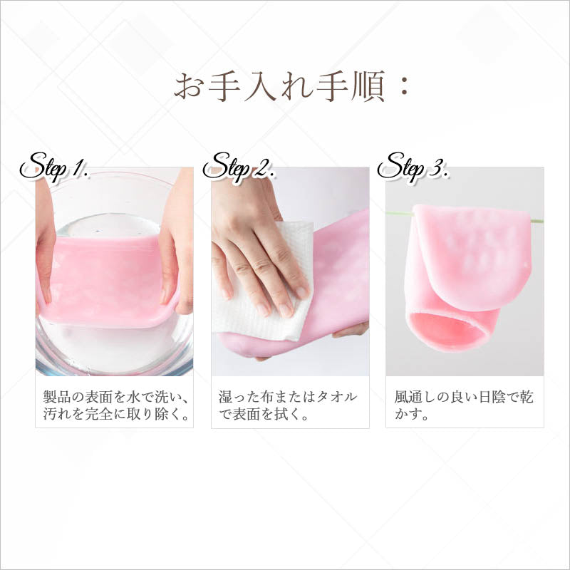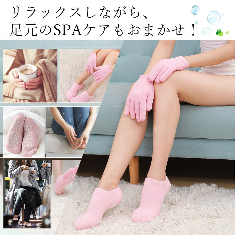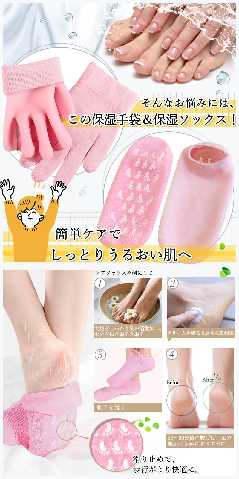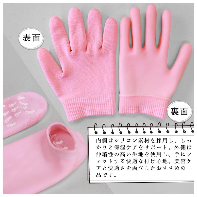 商品特徴 保湿シリコン素材でしっとりケア内側にはシリコン素材を使用し、乾燥しやすい手足をしっかり保湿。潤いを閉じ込めて効果的にケアできます。