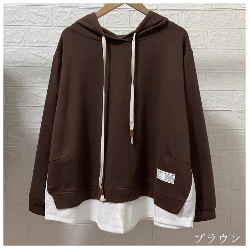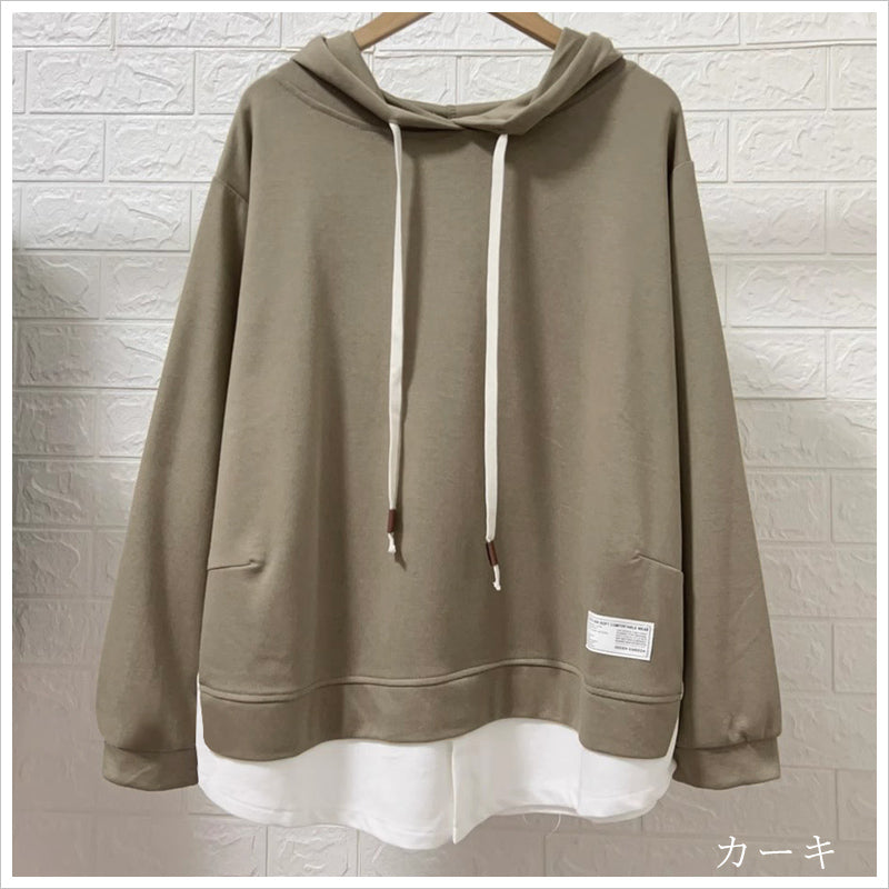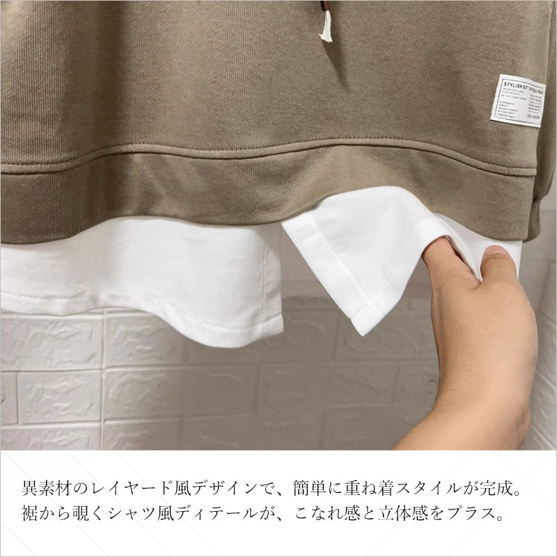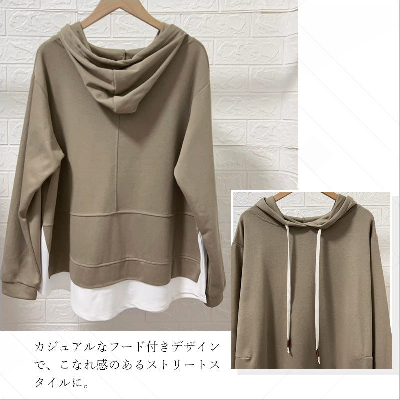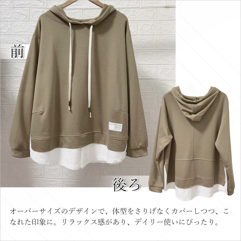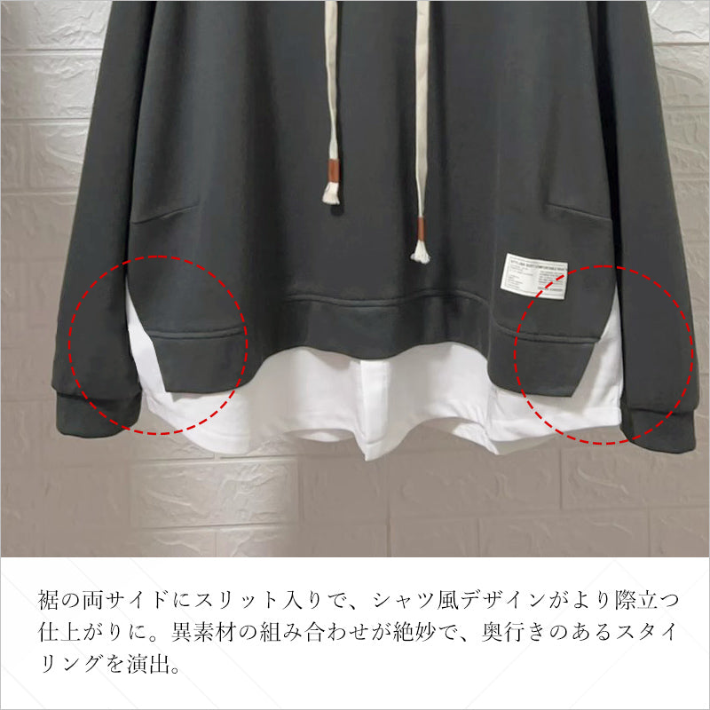 RA993 トップス ゆったり フィット リラックス フード オーバーサイズ 重ね着風 体型カバー レイヤード風