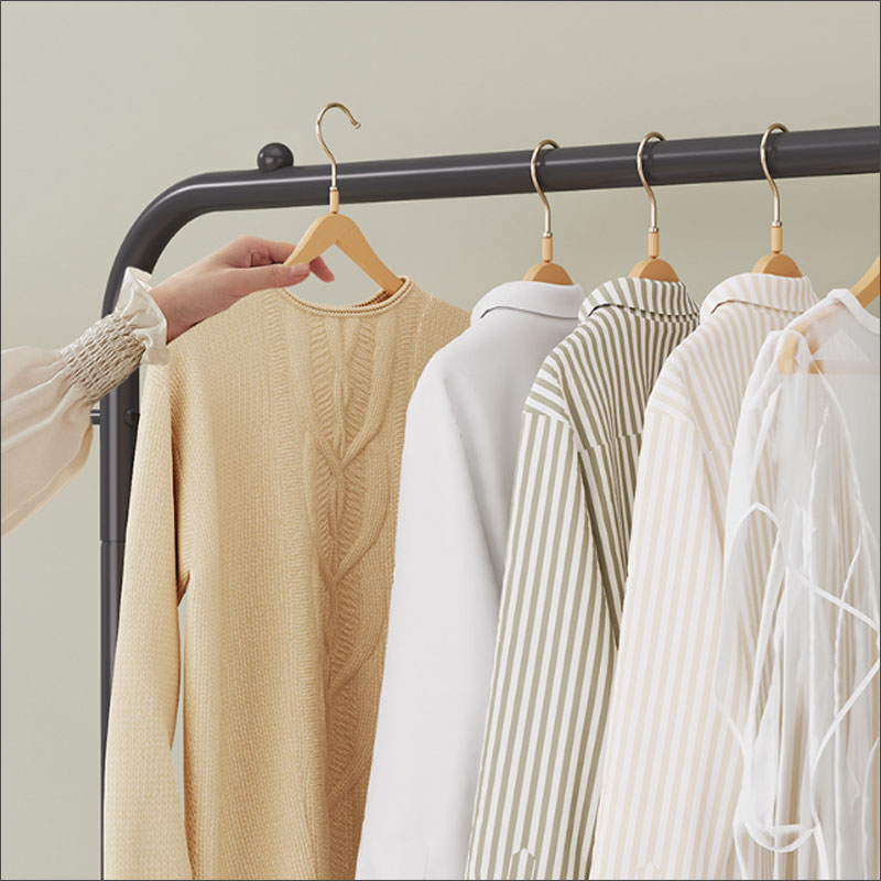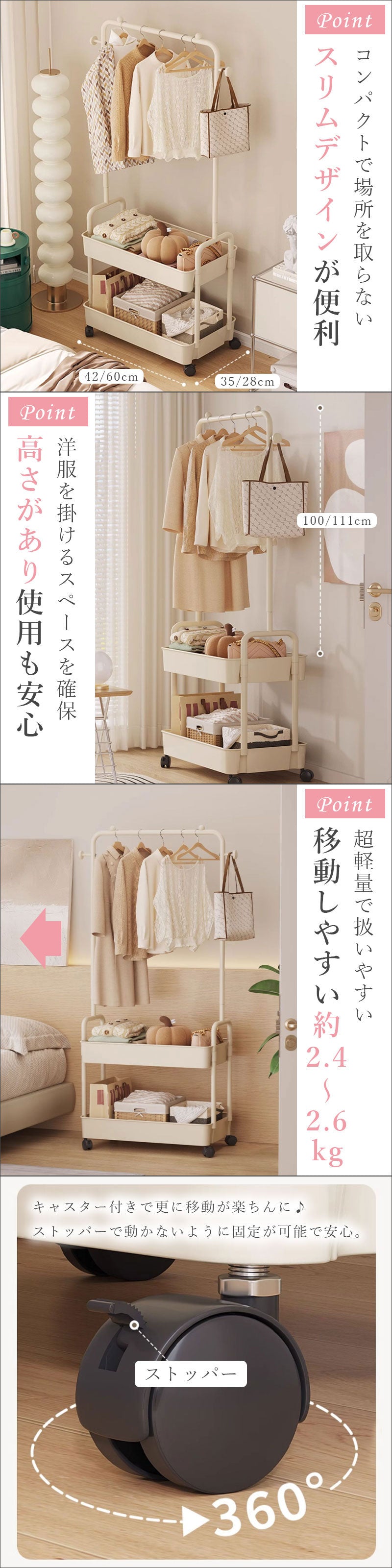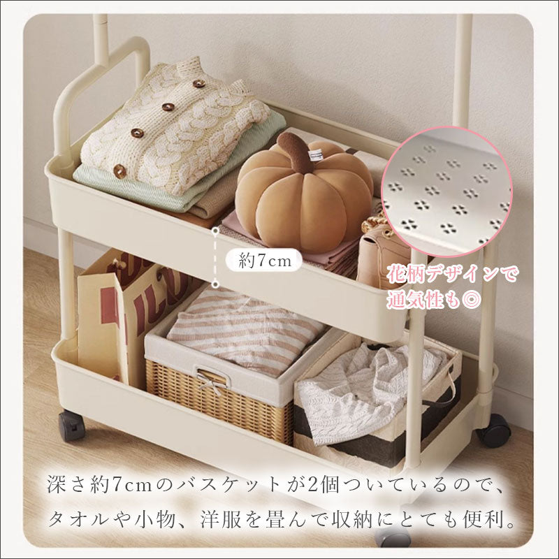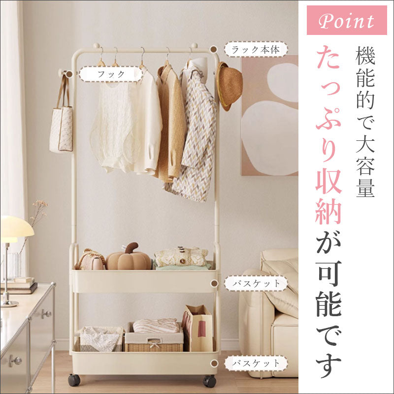 落下防止の突起が付いていてお洋服を掛ける時も安心。小物掛けやバスケット付きでたっぷり収納が可能です。